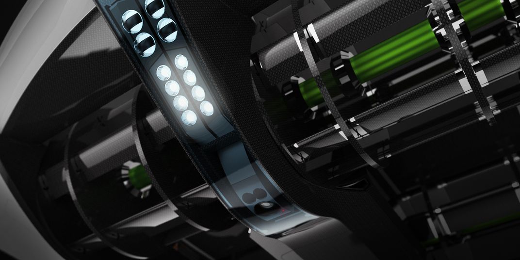 Ein Motor treibt vier Cyclogiro-Rotoren mit verstellbaren Rotorblättern an. Beleuchtung, Kamera und andere Funktionalitäten sind bereits im Rumpfdesign integriert.